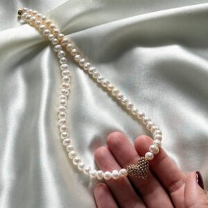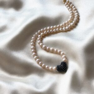 Delikatny, ręcznie robiony naszyjnik z naturalnych pereł średniej wielkości, ozdobiony zawieszką w kształcie czarnego serca uplecionego z drobnych koralików. Klasyczne perły w nowoczesnym wydaniu – kontrast eleganckiej bieli z głębią czerni tworzy wyrazisty, a jednocześnie subtelny akcent. Każda wersja naszyjnika może różnić się nieznacznie, co podkreśla jego indywidualny, rękodzielniczy charakter. Zapięcie ze stali chirurgicznej jest…