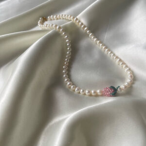 Delikatny, ręcznie robiony naszyjnik z naturalnych pereł średniej wielkości, ozdobiony zawieszką w kształcie różowej maliny. Ten subtelny, a zarazem nieoczywisty dodatek łączy klasyczną elegancję pereł z dziewczęcym urokiem i lekkością owocowego akcentu. Zawieszkę można ułożyć pionowo lub poziomo — wybór zależy od Ciebie. Każda wersja wygląda równie wyjątkowo i nadaje naszyjnikowi indywidualny charakter. Zapięcie ze…