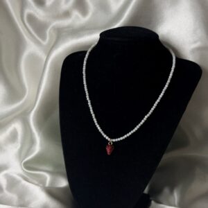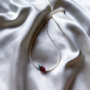 Naszyjnik z drobnych koralików z masy perłowej, ozdobiony zawieszką w kształcie czerwonej poziomki. To delikatna, ale wyrazista biżuteria, która łączy subtelny połysk masy perłowej z owocowym, letnim akcentem. Czerwona poziomka przyciąga spojrzenia i dodaje całości świeżości, lekkości i charakteru. Zapięcie ze stali chirurgicznej zapewnia trwałość i wygodę — także dla osób o wrażliwej skórze. Długość…