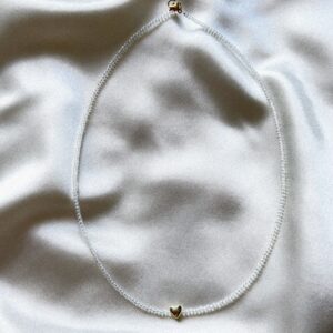 Delikatny, ręcznie robiony naszyjnik z naturalnych pereł średniej wielkości, ozdobiony zawieszką w kształcie złotego serca z drobnych koralików. Klasyczne perły w nowym wydaniu – z ciepłym, błyszczącym akcentem, który dodaje biżuterii miękkości, elegancji i subtelnego blasku. Każda wersja naszyjnika może różnić się nieznacznie, co podkreśla jego indywidualny, rękodzielniczy charakter. Zapięcie ze stali chirurgicznej jest bezpieczne…