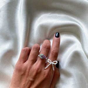 Ręcznie robiony pierścionek z drobnych perełek, ozdobiony maleńką metaliczną malinką wykonaną z koralików. To subtelna, ale wyrazista biżuteria – łączy delikatny połysk pereł z błyskiem malinowego owocu, tworząc efekt eleganckiej słodyczy. Idealny dla osób, które lubią detale z odrobiną blasku i wyjątkowego charakteru. Każdy egzemplarz powstaje ręcznie, dlatego może nieznacznie różnić się w detalach –…
