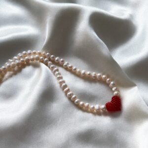 Delikatny, ręcznie robiony naszyjnik z naturalnych pereł średniej wielkości, ozdobiony zawieszką w kształcie czerwonego serca uplecionego z drobnych koralików. Klasyczne perły w nowoczesnym wydaniu – kontrast eleganckiej bieli z intensywną czerwienią tworzy wyrazisty, a jednocześnie romantyczny akcent. Każda wersja naszyjnika może różnić się nieznacznie, co podkreśla jego indywidualny, rękodzielniczy charakter. Zapięcie ze stali chirurgicznej jest…