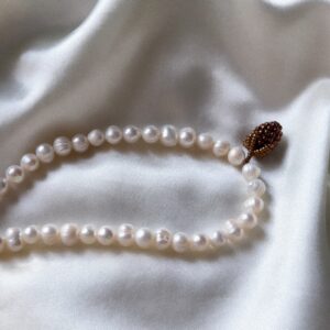 Delikatny, ręcznie robiony naszyjnik z naturalnych pereł średniej wielkości, ozdobiony zawieszką w kształcie różowo-przezroczystej maliny. Ta subtelna, lekko błyszcząca zawieszka wprowadza do klasycznej elegancji pereł świeży, dziewczęcy akcent i nutę delikatnej tajemnicy. Zawieszkę można ułożyć pionowo lub poziomo — wybór zależy od Ciebie. Każda wersja podkreśla indywidualny charakter naszyjnika i nadaje mu wyjątkowego blasku. Zapięcie…